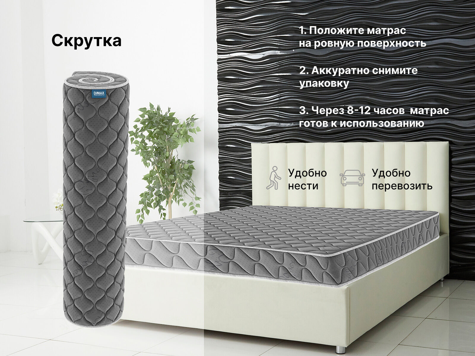 Компактная высота позволяет скручивать матрас и хранить изделие в укромном месте, экономя пространство.