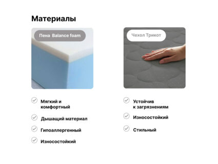 Balance foam отлично вентилируется за счёт особой пористой структуры. Слой не только пропускает воздух, но и поддерживает оптимальную температуру тела, способствуя естественной терморегуляции.
