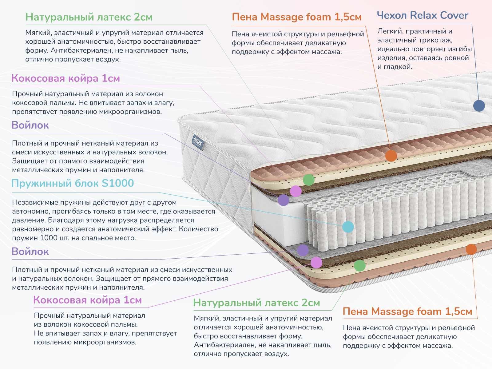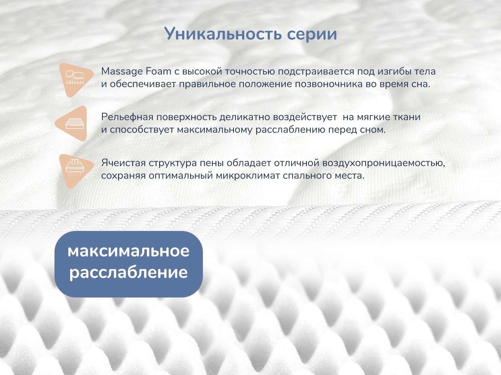 Чехол матраса получил массажные возможности за счёт рельефной пены, которая входит в его структуру. Трикотаж простёгивается на слое конволюторного пенополиуретана и в результате чего спальная принадлежность обретает множество массажных бугорков по всей своей площади.