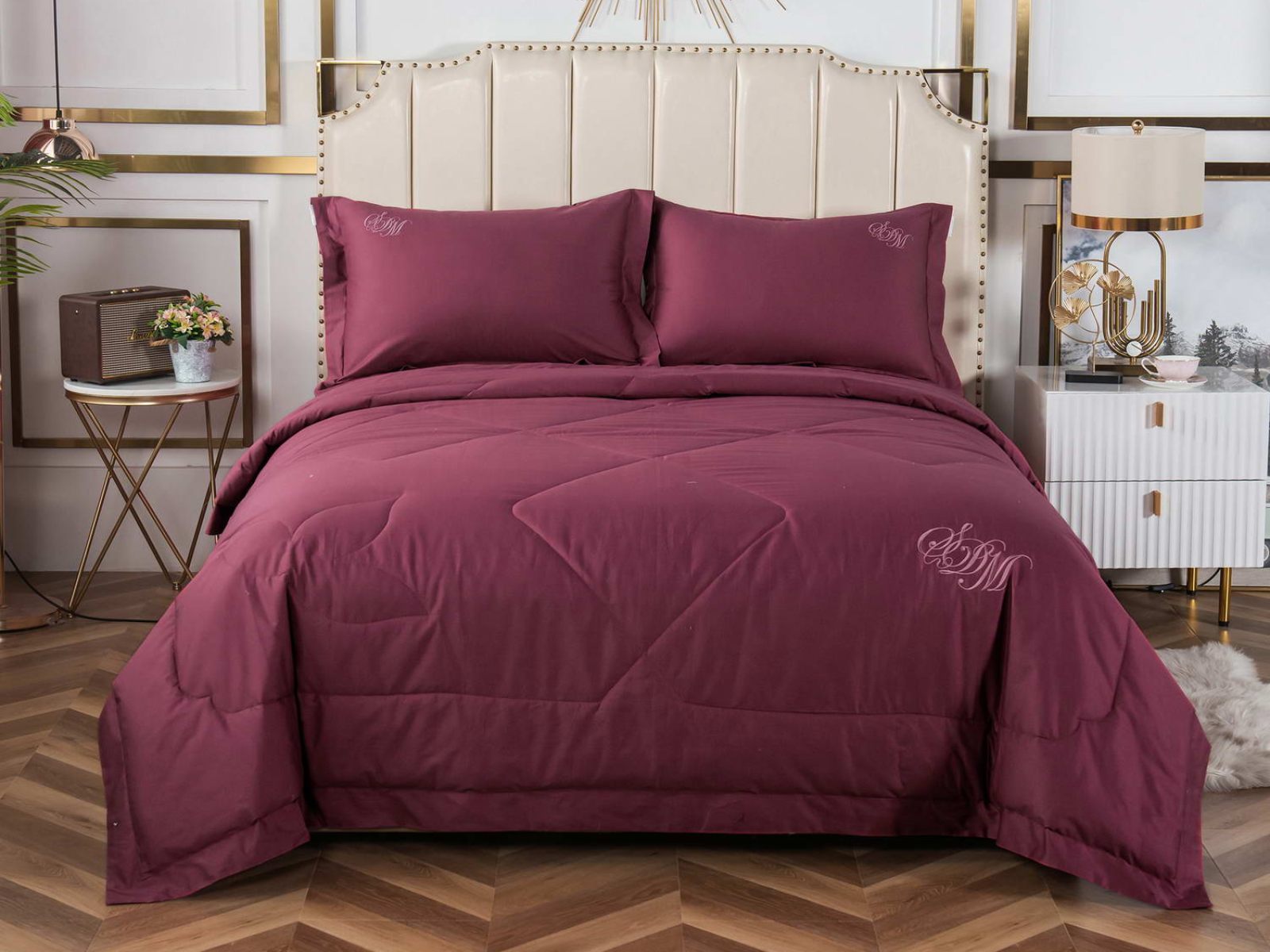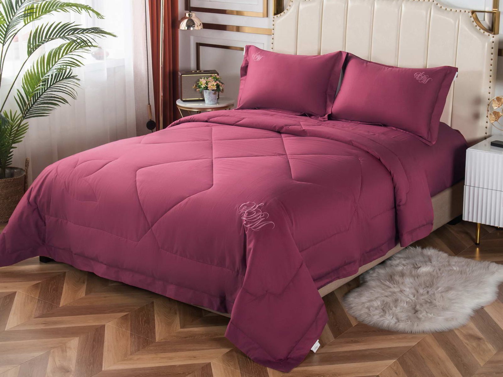 В комплект входят простыня, наволочки и одеяло. Одеяло простеганное, легкое и воздушное, его можно стирать в стиральной машине. Благодаря микроволокну в составе наполнителя для одеяла, оно всегда принимает свою начальную форму.
