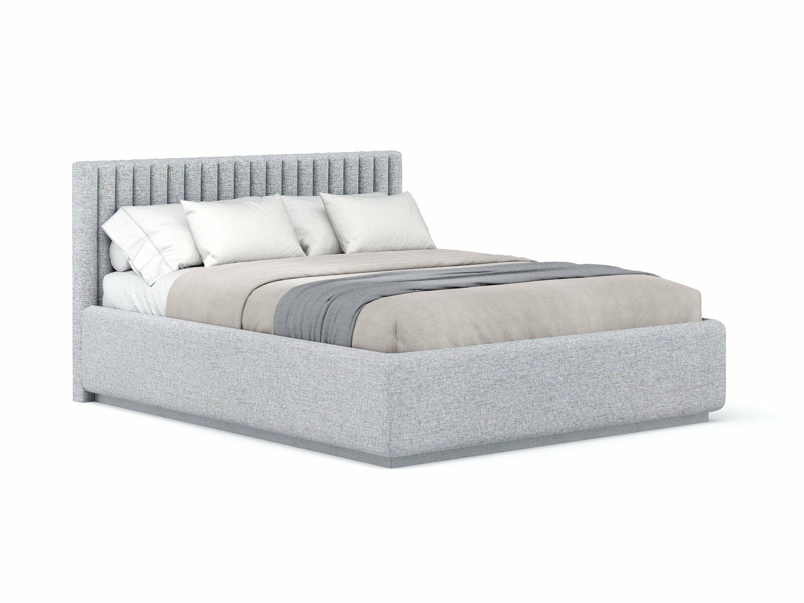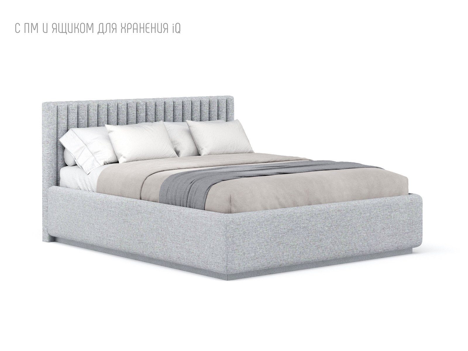 Кровать укомплектована IQ с подъемным механизмом и ящиком для белья без дна (дополнительная платная опция - дно к ящику IQ из HDF (ХДФ). Каркас кровати на цоколе, декоративный чехол на цоколе съёмный. Глубина ящика для белья - 30 см, без ограничения нагрузки на ящик.