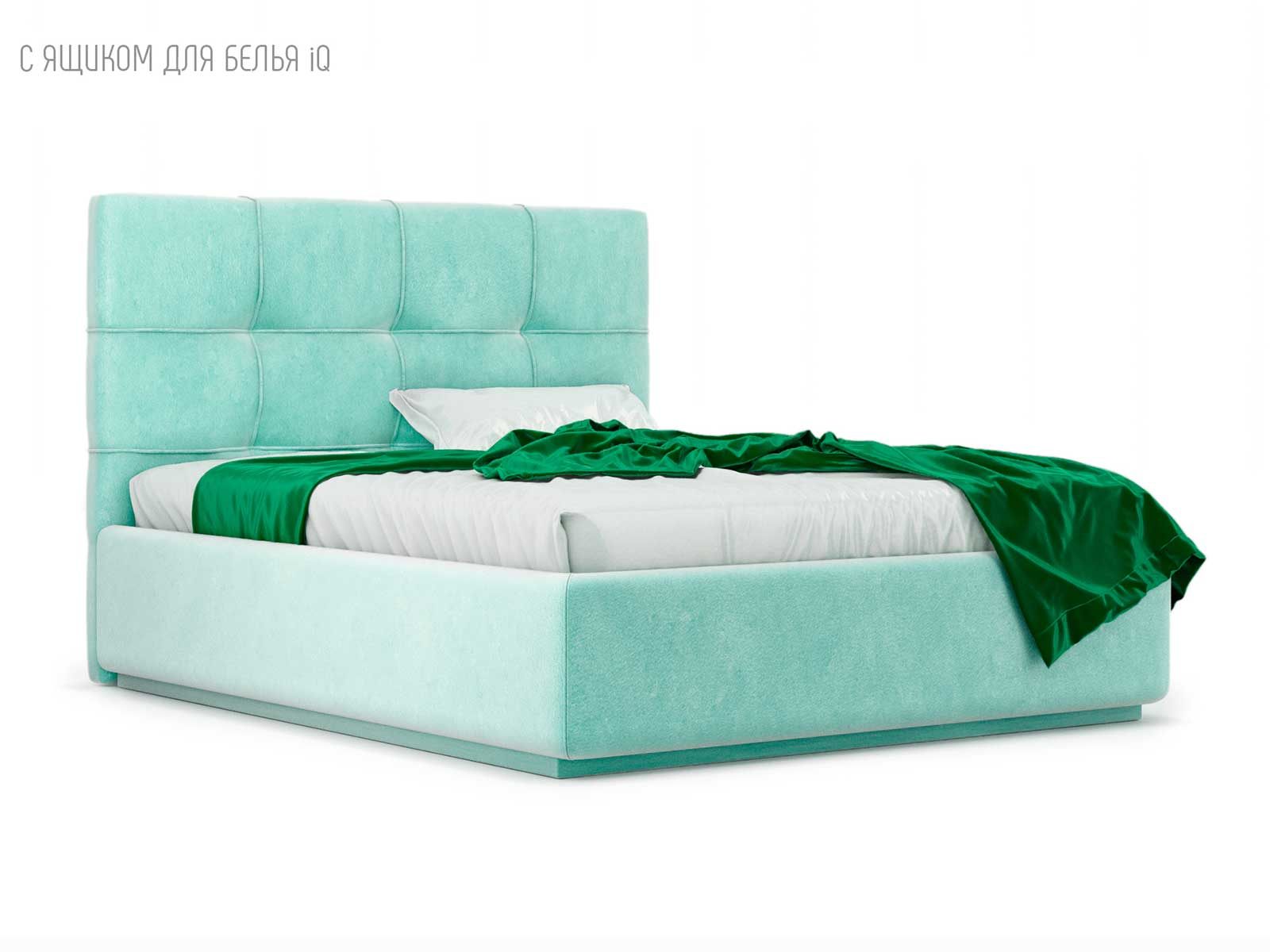 Кровать укомплектована IQ с подъемным механизмом и ящиком для белья без дна (дополнительная платная опция - дно к ящику IQ из HDF (ХДФ). Каркас кровати на цоколе, декоративный чехол на цоколе съёмный. Глубина ящика для белья - 30 см, без ограничения нагрузки на ящик.