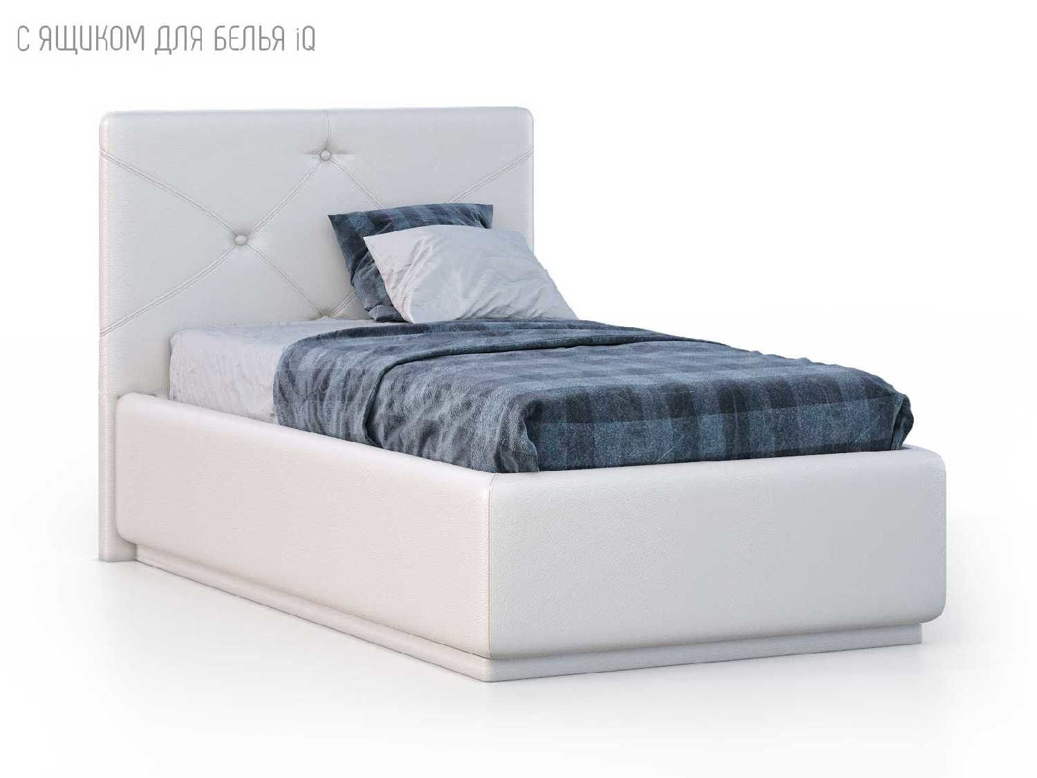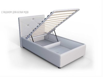 Кровать укомплектована IQ с подъемным механизмом и ящиком для белья без дна (дополнительная платная опция - дно к ящику IQ из HDF (ХДФ). Каркас кровати на цоколе, декоративный чехол на цоколе съёмный. Глубина ящика для белья - 30 см, без ограничения нагрузки на ящик.