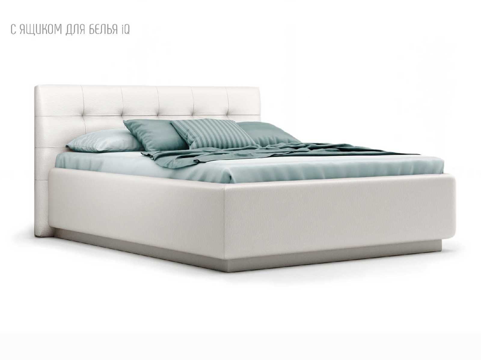 Кровать укомплектована IQ с подъемным механизмом и ящиком для белья без дна (дополнительная платная опция - дно к ящику IQ из HDF (ХДФ). Каркас кровати на цоколе, декоративный чехол на цоколе съёмный. Глубина ящика для белья - 30 см, без ограничения нагрузки на ящик.