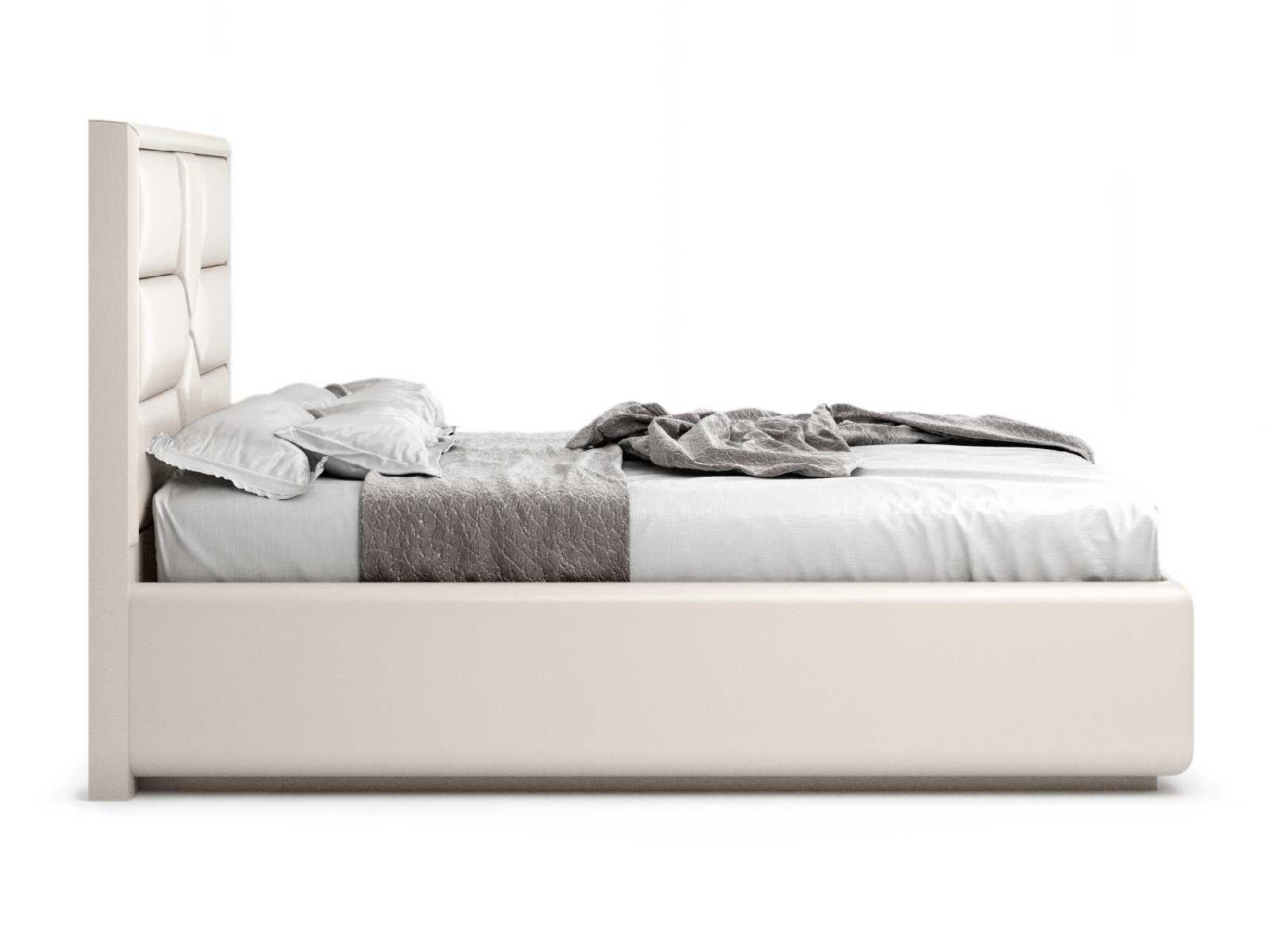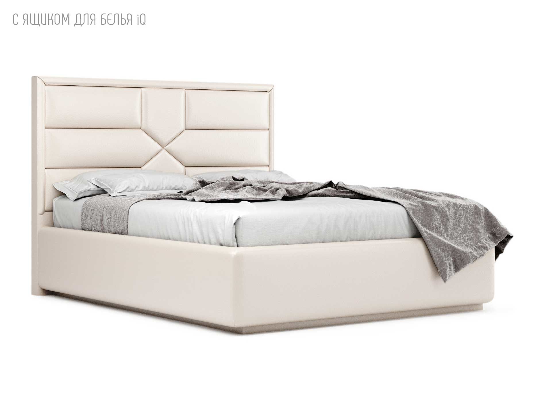 Кровать укомплектована IQ с подъемным механизмом и ящиком для белья без дна (дополнительная платная опция - дно к ящику IQ из HDF (ХДФ). Каркас кровати на цоколе, декоративный чехол на цоколе съёмный. Глубина ящика для белья - 30 см, без ограничения нагрузки на ящик.