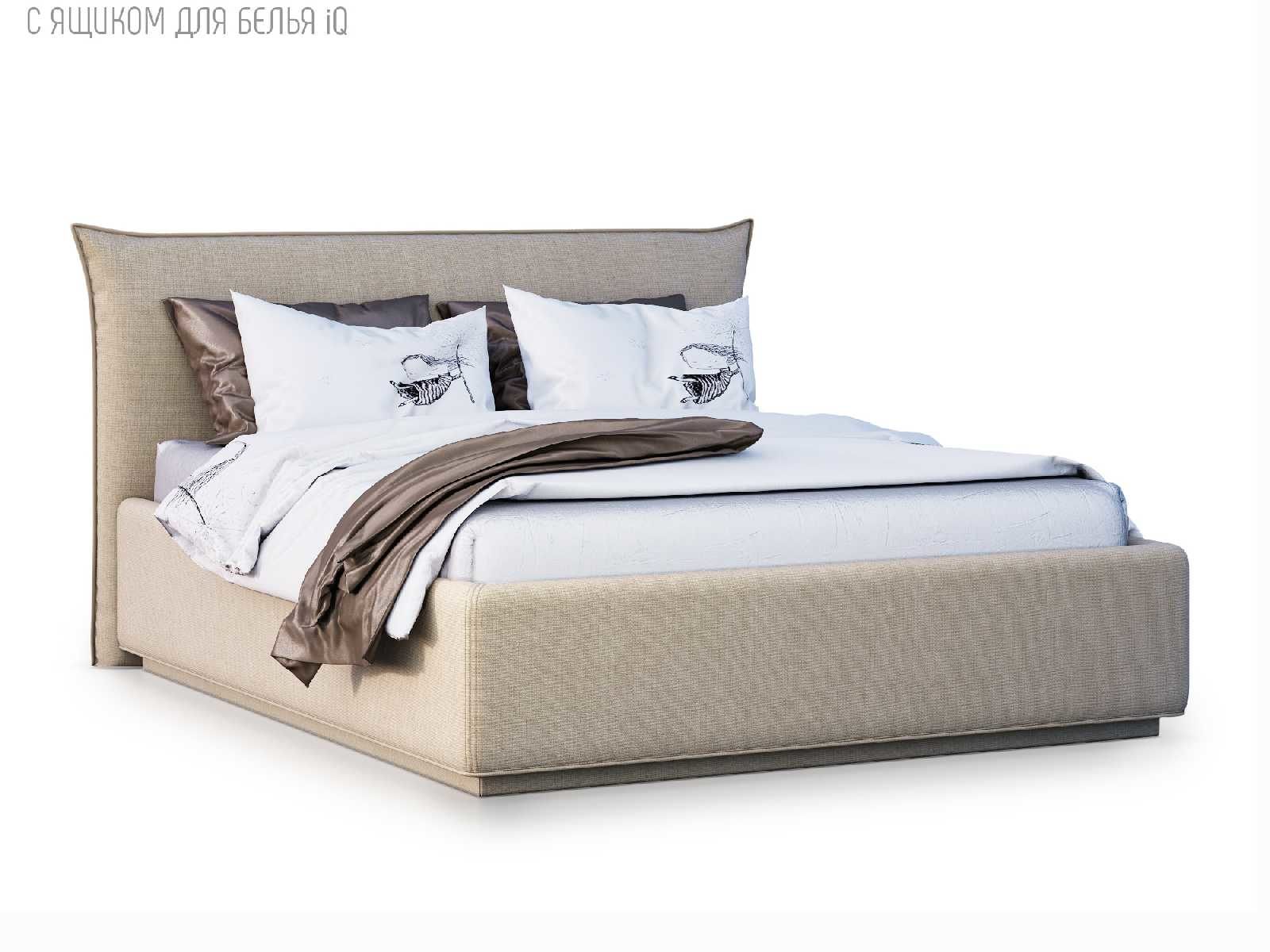 Кровать укомплектована IQ с подъемным механизмом и ящиком для белья без дна (дополнительная платная опция - дно к ящику IQ из HDF (ХДФ). Каркас кровати на цоколе, декоративный чехол на цоколе съёмный. Глубина ящика для белья - 30 см, без ограничения нагрузки на ящик.