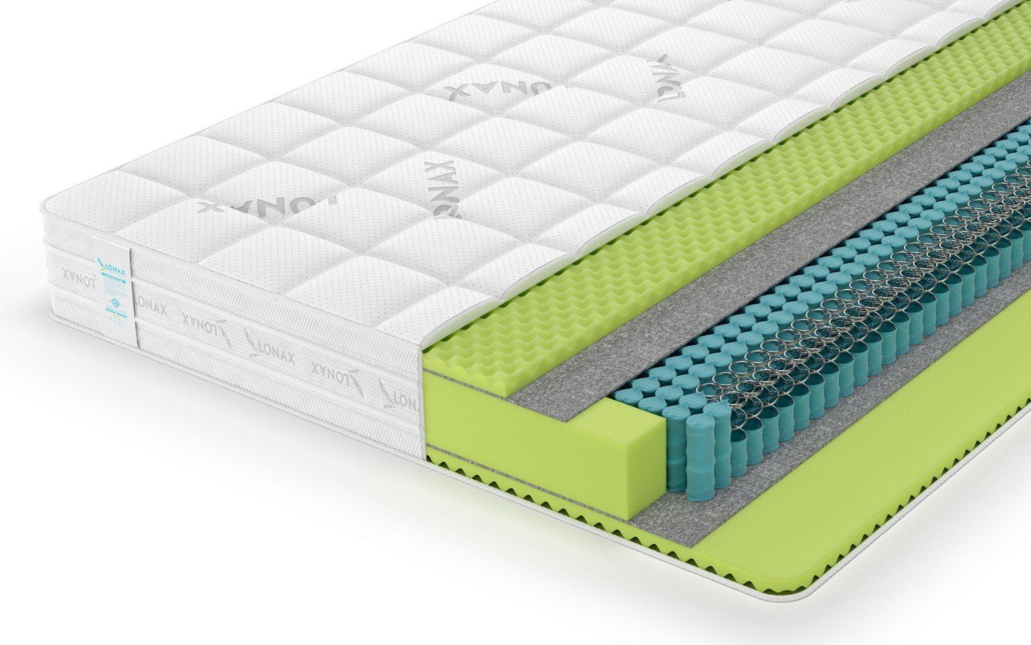 Красивый и объёмный матрас Relax ППУ S1000 оснащён примечательных чехлом. Изделие оббито серебристо-белым жаккардом с хлопково-вискозным составом материала, который разлинован аккуратной квадратной стёжкой. Ткань имеет фирменный принт Lonax, который является гарантом оригинальности модели.