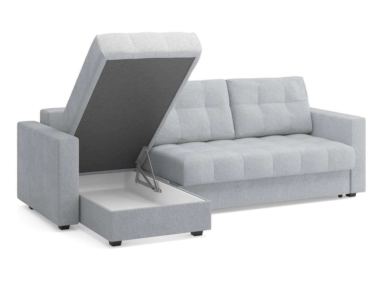 Короб для хранения из белого ЛДСП разделен на 2 части (основная секция). Глубина короба 19 см является достаточной для комфортного хранения аксессуаров для сна, подушек от дивана и прочих необходимых вещей.