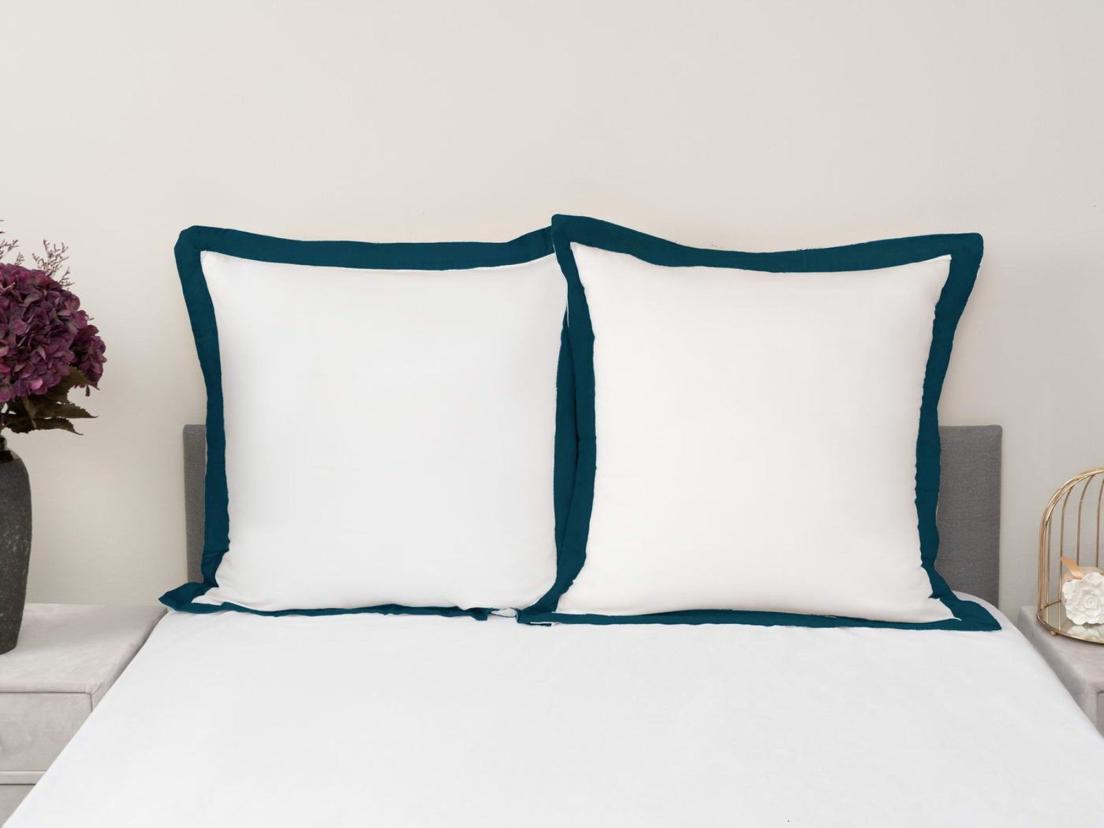 Особенность: белые наволочки декорированы контрастными цветными ушками 5 см с четырех сторон. Наволочки на запахе.