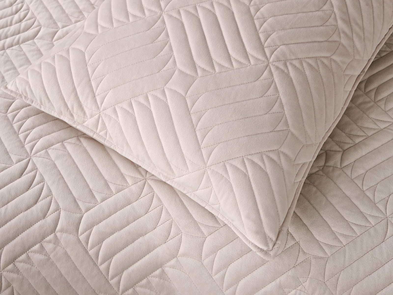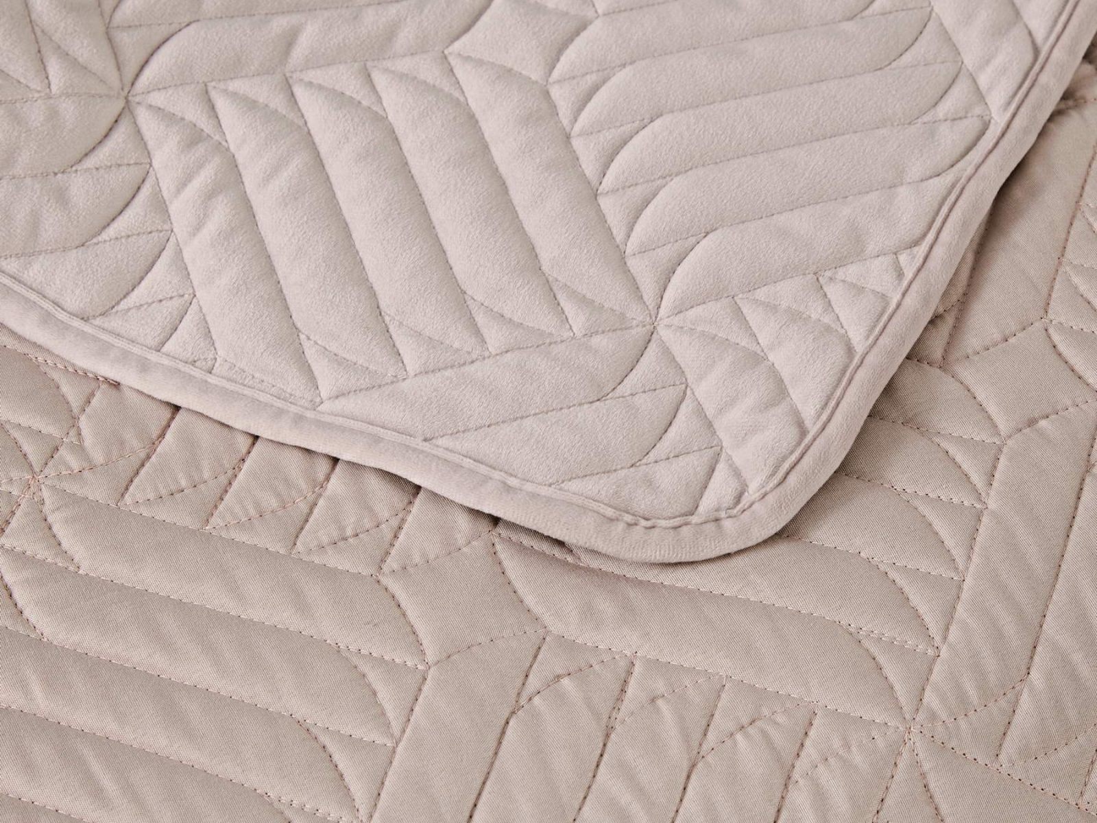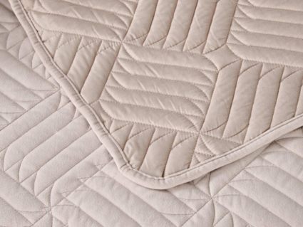 Покрывала выполнены в 10 оттенках: крем, мокко, пепельный, песочный, светло-бежевый, светло-серый, серый, темно-серый, чайная роза и черный. Стежка в виде геометрического орнамента подойдет к любому современному интерьеру. Из-за особого плетения, велюровая ткань покрывала отражает свет и красиво переливается при различном освещении.